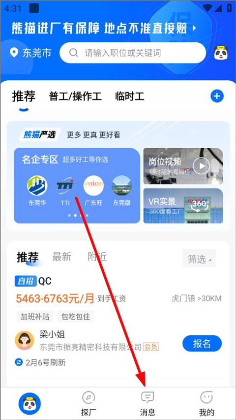 打开熊猫进厂应用,登录后进入首页,用户能在首页浏览推荐职位、普工/操作工、临时工等各类岗位信息,随后点击消息模块。