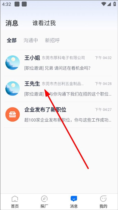进入消息页面后,用户能查看当前处于沟通状态的职位,点击相应职位即可进入聊天界面。