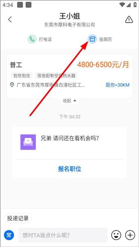进入聊天界面后,用户能够查看过往的聊天记录、了解职位的详细信息,只需点击“投简历”按钮,就能把自己的简历发送给对应的招聘者。
