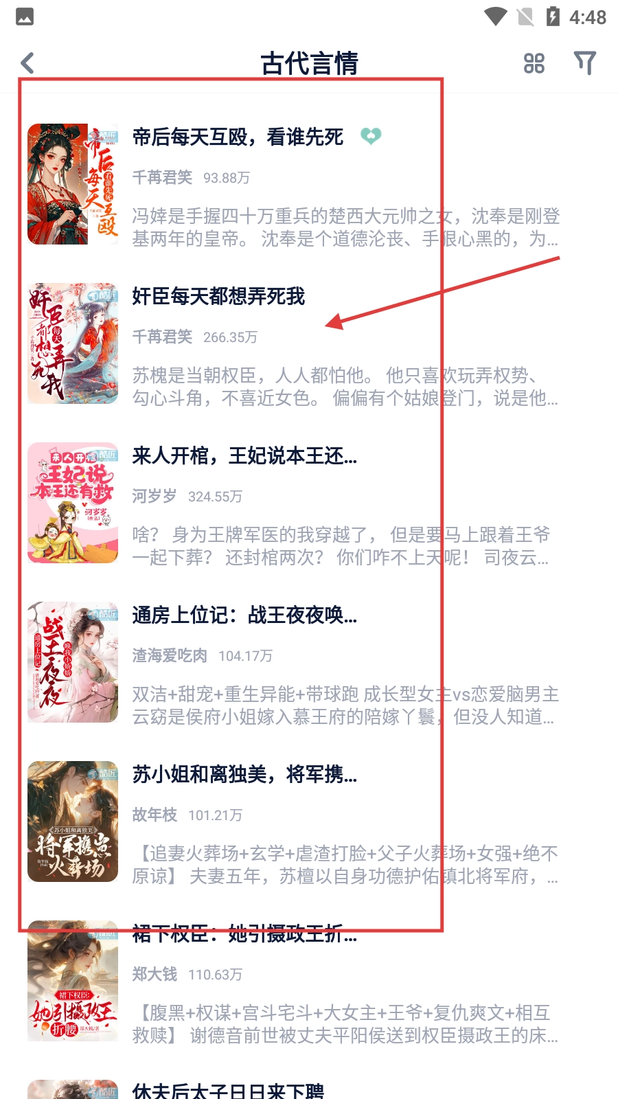 在古代言情小说的列表里,找到《奸臣每天都想弄死我》这本书并点击它,这样就能进入到小说的详情页面了。