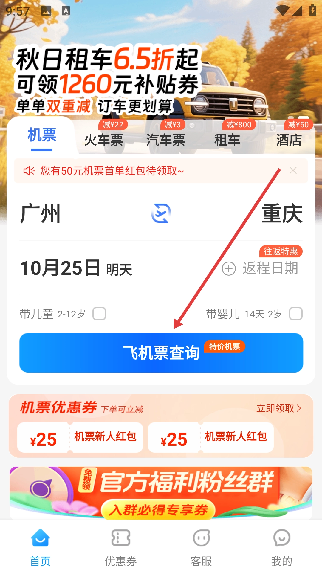 在首页选定出发地(例如广州)、目的地(例如重庆)以及出行日期(例如10月25日),接着点击【飞机票查询】按钮。
