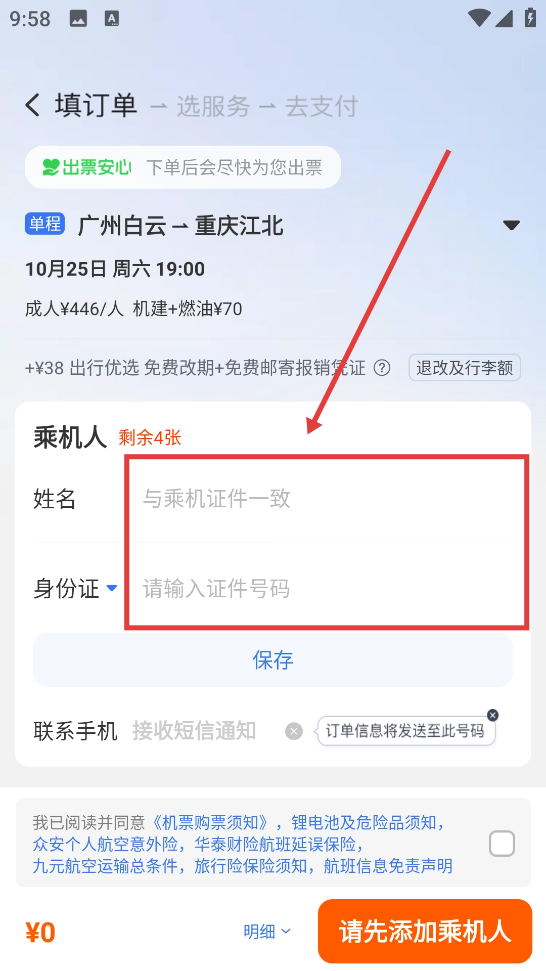 点击航班旁的【订】按钮,进入填订单页面。