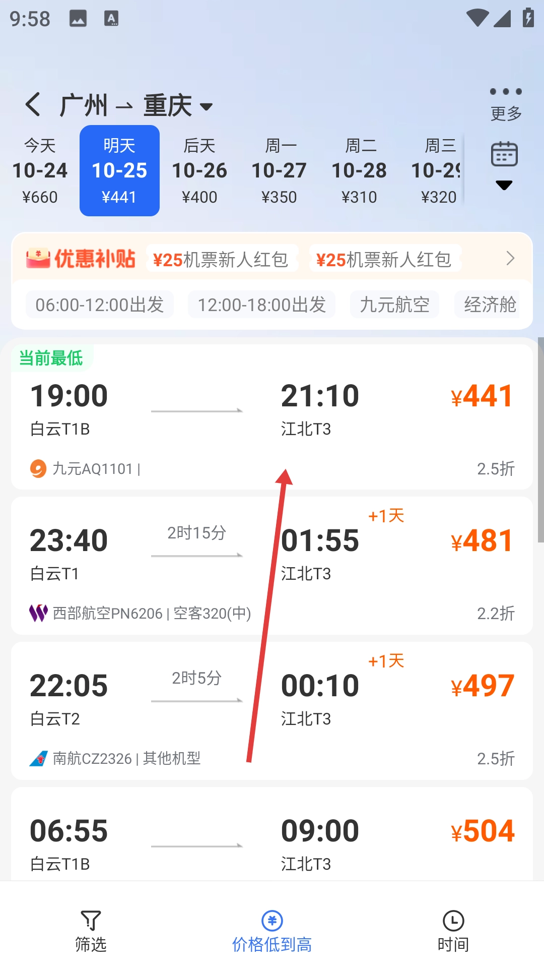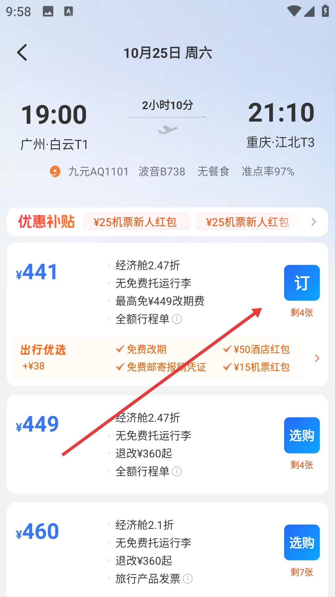 从航班列表里挑选出你要找的航班,比如九元AQ1101这趟,它19:00从广州白云T1起飞,21:10到达重庆江北T3。