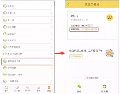 可以保存快递员名片的小程序码图片,也能直接点击分享给微信好友,或是分享到朋友圈。
