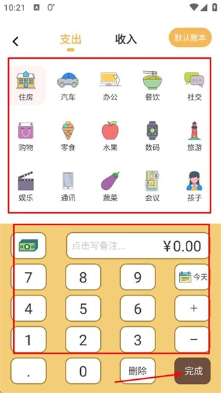 在记账页面选定支出分类、输入金额后,点击完成按钮即可结束本次记账操作。