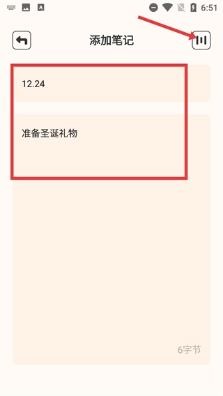 在添加笔记的界面中,填写相应的日期(例如12.24)以及笔记内容(例如“准备圣诞礼物”)。