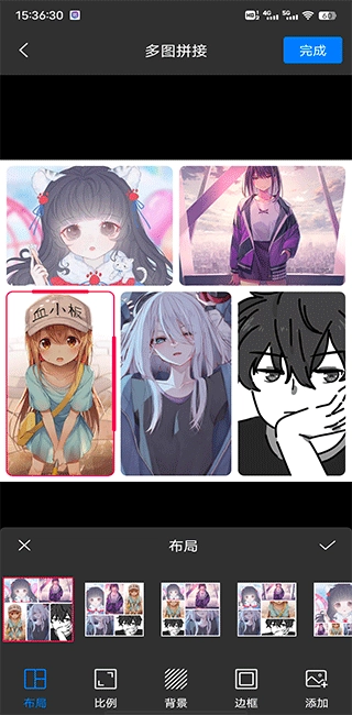 在拼图的过程中,你可以挑选自己喜欢的布局,还能更换背景、调整比例、设置边框等,并且可以点击单张图片进行编辑。