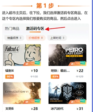 1、进入游戏超市后,往下拉选择激活码专区