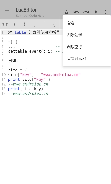 丰富的参考资源:提供了海量Lua语言相关的参考资料,涵盖文档、教程、示例代码等,助力用户迅速查阅与学习Lua语言的各类知识点。 出色的编辑器:支持编写LuaJava代码,同时配备了一键清除注释、一键删除空行、代码折叠、语法高亮等多样编辑功能,便于用户高效地进行代码编写与调试工作。
