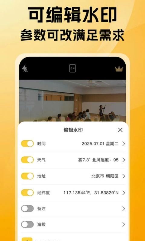 1、完成安装并进入应用后,可根据具体的拍摄场景,对水印信息进行编辑设置。