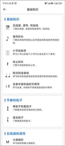 这个应用程序的界面设计简洁又现代,用户能够通过点击屏幕上的各类选项来浏览不同的乐理知识点。这些知识点涵盖乐谱绘制、和声分析、乐器演奏原理等内容,尤其对初学者而言,音高、节奏、符号、调性等方面都有详细讲解。