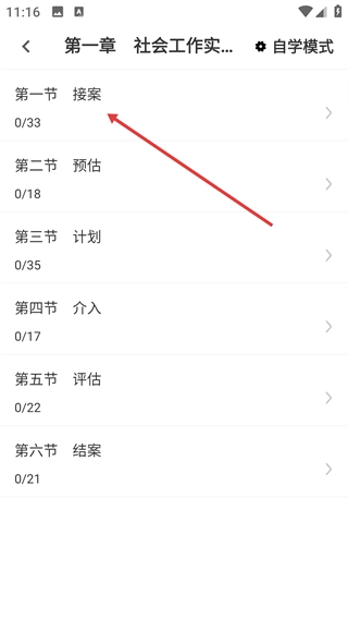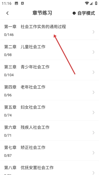 2、在章节练习列表里,挑选想要练习的目标章节(例如【第一章-社会工作实务的通用过程】),接着进入该章节对应的小节练习列表。