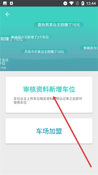 2、在车位分享页面,点击【审核资料新增车位】选项,即可进入车场选择界面。