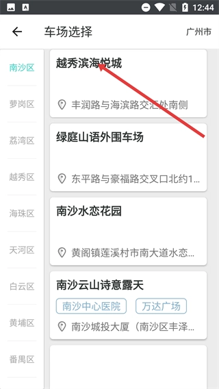3、进入车场选择页面后,选定目标车场(例如“越秀滨海悦城”),即可进入添加车位的信息填写界面。