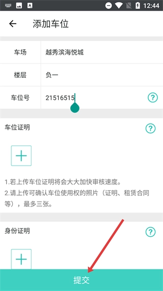 在添加车位的页面中,依次填写车场、楼层、车位号等相关信息,接着上传车位证明与身份证明材料,之后点击【提交】按钮,即可完成新增车位的资料提交操作。