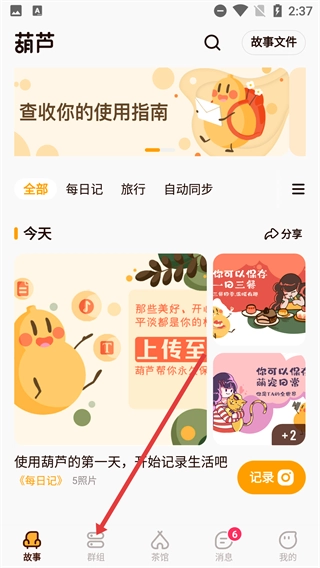 1、在“葫芦”的故事页面,点击底部导航栏中的【群组】选项,即可进入群组管理页面。