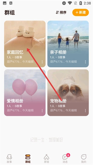 2、进入群组页面后,找到并选中目标群组(例如“家庭回忆”),即可进入该群组的详情界面。