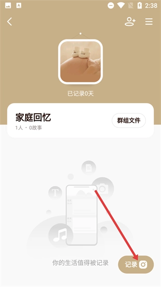 3、进入群组详情页面后,找到并点击【记录】按钮,即可跳转至“写故事”的内容编辑界面。