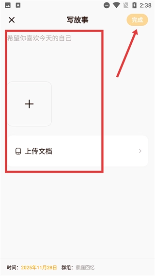 4、进入写故事页面后,填写文字内容并添加图片、文档等素材,随后点击【完成】按钮,即可完成该群组下的内容记录。