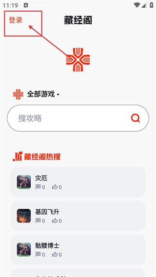1、在藏经阁主界面点击左上角的【登录】按钮,即可进入账号创建流程;此界面包含游戏攻略类相关内容,需完成登录操作后方可使用。