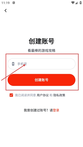 2、进入【创建账号】页面后,填写手机号,勾选同意【用户协议】与【隐私政策】,再点击【创建账号】按钮即可发起注册流程。