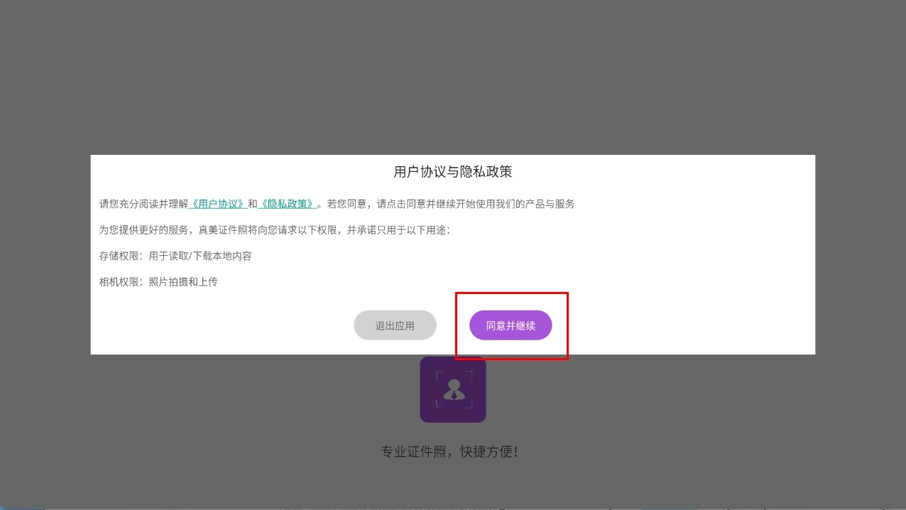 1、点击【同意并继续】按钮,以此确认已了解并同意《用户协议》与《隐私政策》,随后即可进入应用的后续流程。
