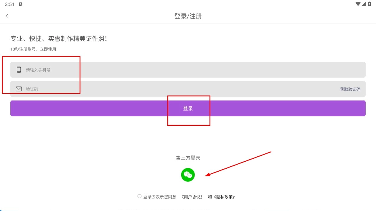 3、登录时,您可以通过输入手机号并填写验证码后点击【登录】按钮,也可以选择微信第三方登录方式,完成账号验证后即可使用应用功能。