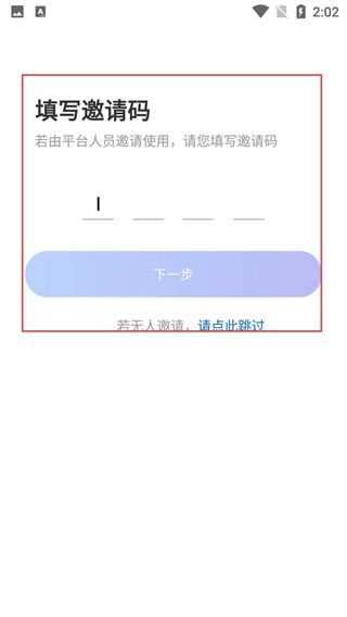 3、登录后进入【填写邀请码】页面,要是有平台人员邀请的话就填写邀请码,没有邀请的话就点击【请点此跳过】进入主界面。