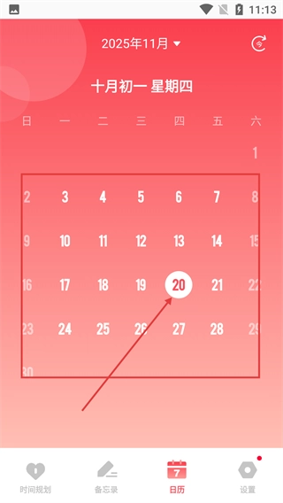 进入主界面后,系统默认展示【日历】页面,底部设有时间规划、备忘录等功能的入口。
