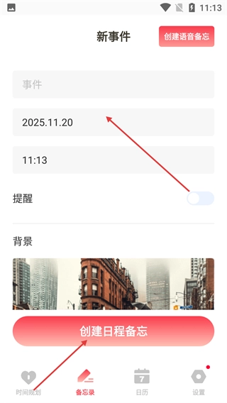3、在【备忘录】页面,进入【新事件】编辑界面,能够填写事件内容、选择日期时间,开启提醒后点击【创建日程备忘】即可完成记录。