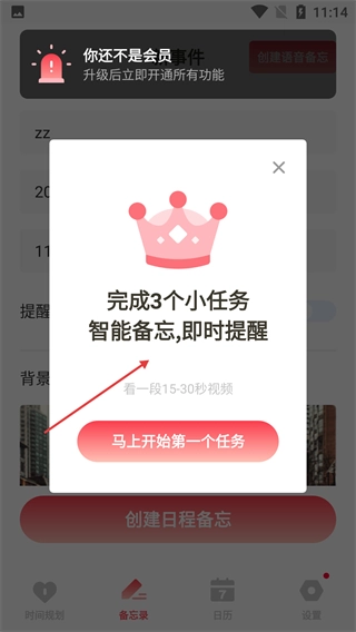 4、创建备忘时会弹出任务提示框,提示完成3个小任务即可解锁智能备忘功能,点击【马上开始第一个任务】按钮就能参与任务以获取该功能权限。