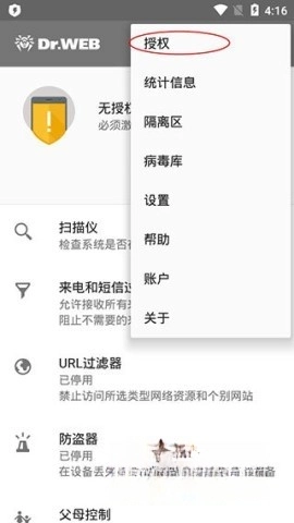 1、首先在您的手机上安装大蜘蛛杀毒(Dr.Web),启动程序后,初始界面会显示“无授权”,您只需点击右上角的菜单按钮,然后选择“授权”这一选项即可。