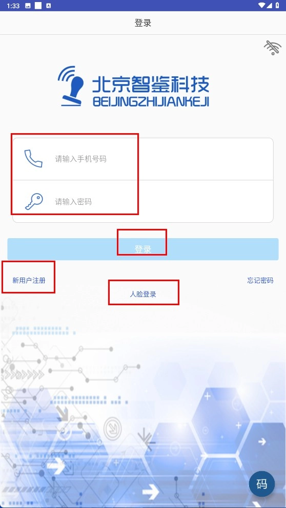 1、进入登录页面后,可在相应输入框中填写手机号码与密码,点击登录按钮即可完成登录操作;若是新用户,则可点击新用户注册选项,也能选择人脸登录的方式。