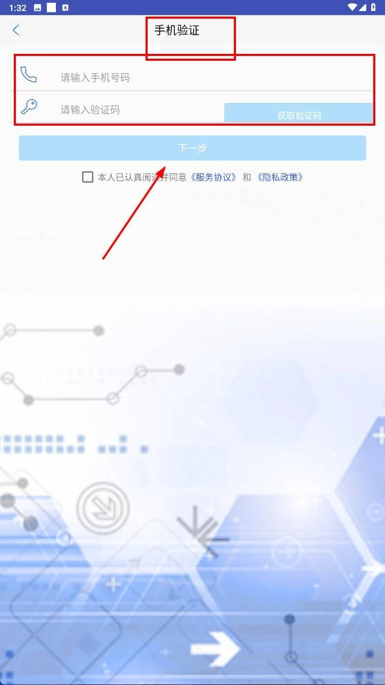 2、进行手机验证时,先输入手机号码,点击“获取验证码”按钮,接着填写收到的验证码,同时勾选同意服务协议与隐私政策,最后点击“下一步”,即可完成手机验证环节的流程。