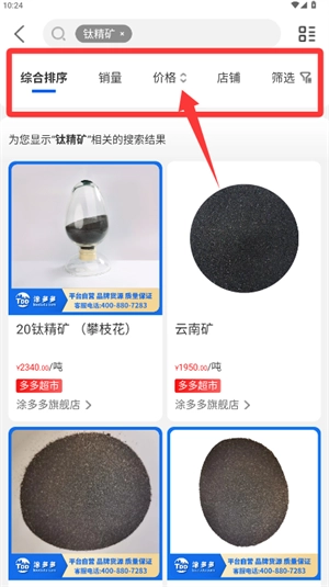 3、在页面搜索钛精矿这类产品,借助综合排序的方式来筛选出合适的货源。