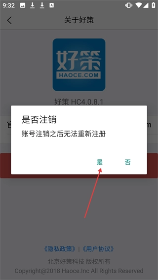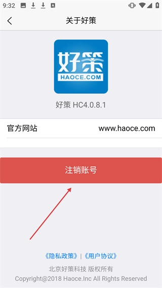 3、进入【关于好策】页面后,点击【注销账号】按钮。