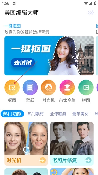 1、打开【美图编辑大师】,在首页找到并点击【抠图】功能图标,随即进入图片选择页面。