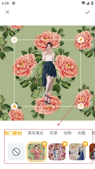 4、在素材选择页面挑选心仪的背景素材,就能让抠图后的模特与该背景自然融合,同时还能对模特在背景里的位置和大小进行调整。