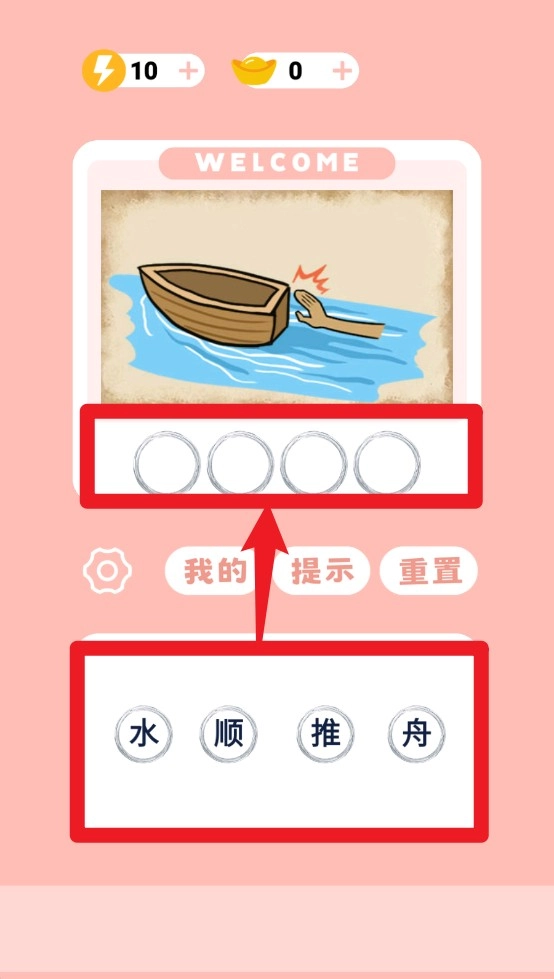 1、按照图片给出的提示挑选成语,要按照先后顺序点击下方的文字来组合成正确答案,例如“顺水推舟”。