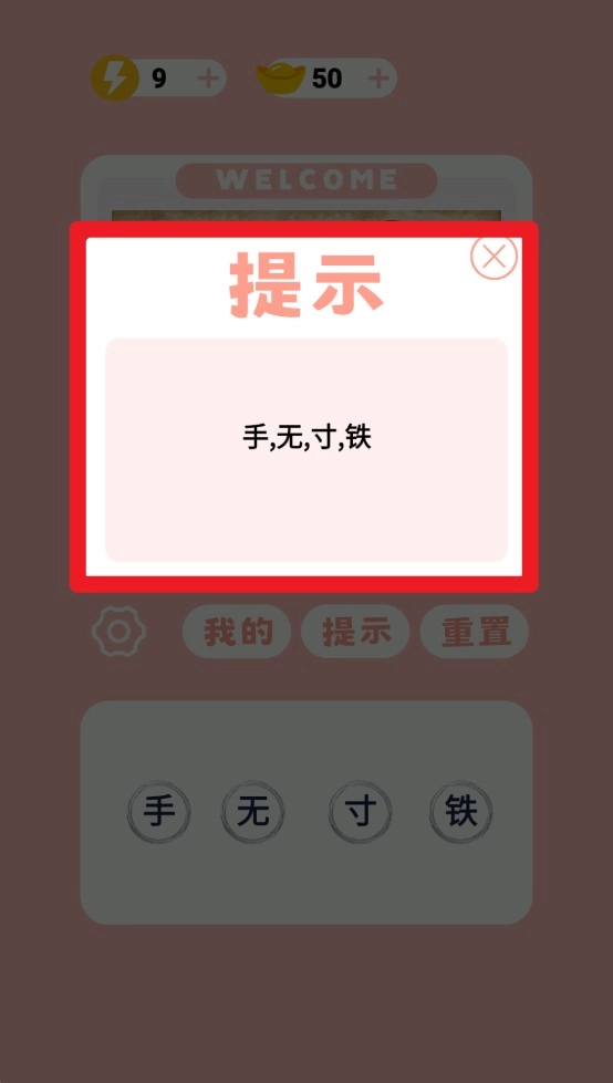 3、点击“提示”按钮后会弹出关键字,辅助用户更快捷地猜出正确答案。