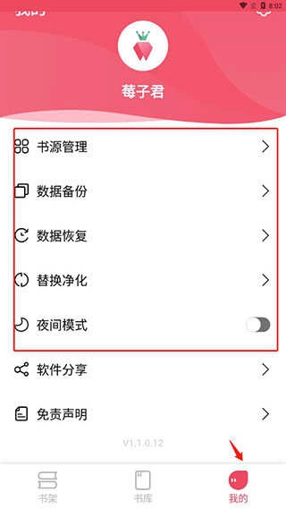 5、在个人中心页面,用户能够进行书源管理、数据备份与恢复操作,还可以设置替换净化规则,以及开启夜间模式等功能;