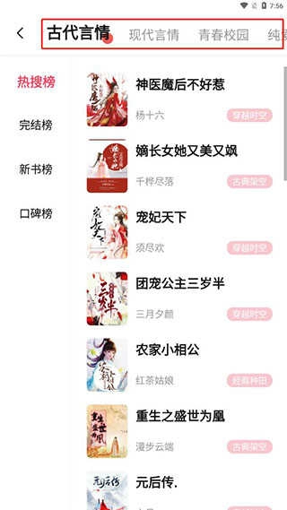 3、在排行榜区域,能查看各类小说的热搜榜、完结榜、新书榜和口碑榜。