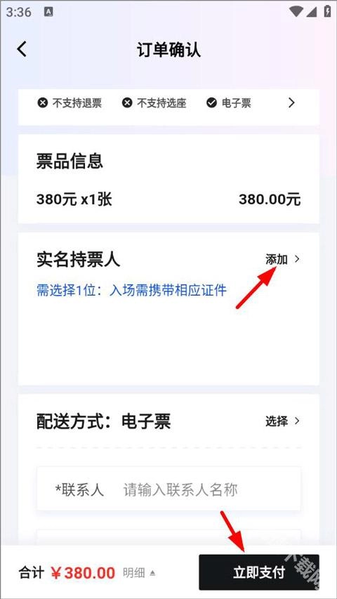 5、用户下单后,需填写持票人信息(包括姓名、证件类型及号码)、配送方式、联系人以及联系方式等内容,点击“立即支付”按钮即可完成购票。