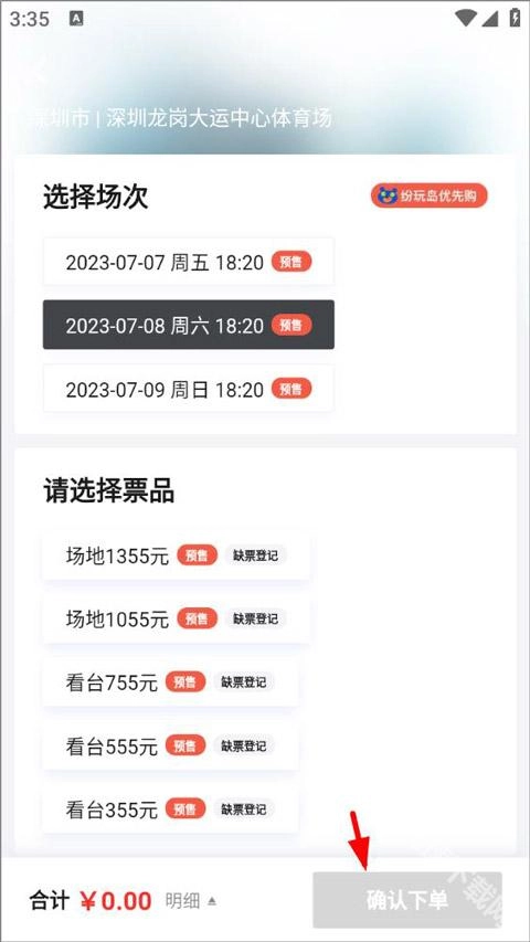 4、进入购票页面后,用户需挑选合适的场次与票品,随后确认下单;