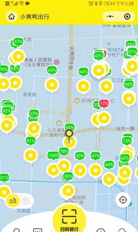 3.当您授权应用获取定位权限后,就能查看周边的可用车辆。点击车辆即可进行预约,预约期间其他用户无法使用该车辆。绿色百分比显示的是车辆剩余电量,红色则代表电量较低的车辆。