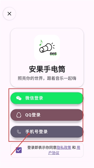 3、登录界面提供【微信登录】【QQ登录】【手机号登录】三种登录选项,登录操作前需勾选同意【隐私政策】与【用户协议】。