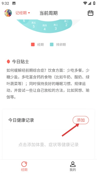 在记经期页面,点击【今日健康记录】旁边的【添加】按钮,就能进入健康记录填写界面,记录身体的相关数据。
