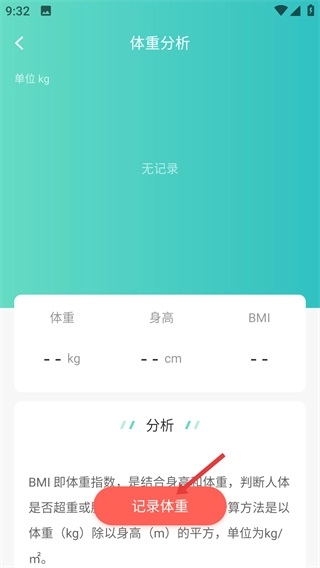3、进入体重分析页面后,点击【记录体重】按钮,即可开启体重信息的记录流程。