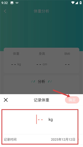 4、在体重记录弹窗里,填写好体重数值并确认记录时间后,点击【确定】按钮,即可完成体重记录的操作。