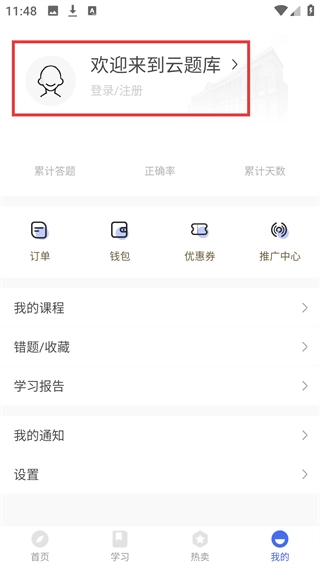 2、进入对应的页面后,找到【欢迎来到云题库-登录/注册】区域。